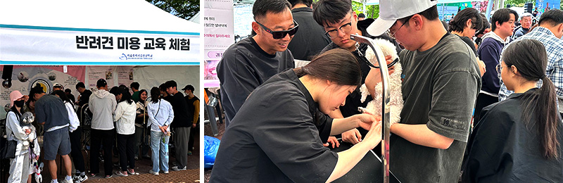 반려동물미용과정은 행사장을 찾은 반려견을 대상으로 브러싱, 귀 청소, 발톱 손질 등의 위생 관리 서비스를 직접 시연하며, 보호자들이 일상에서 실천할 수 있는 반려동물 관리 팁을 소개했습니다. 학교에서 배우며 쌓은 실무 기술과 정성 어린 손길로 행사를 방문한 강아지와 견주들의 편안한 표정을 볼 수 있었습니다.