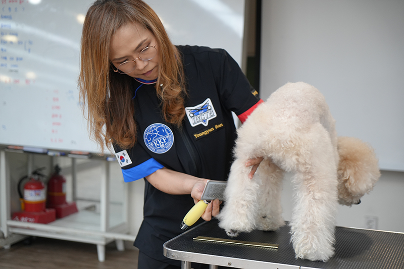 이후에는 교수님이 직접 반려견 미용 시연을 선보였습니다. 브러싱 스킬과 미용 스킬 등 반려동물 미용에 필요한 기술을 차근차근 설명해 주시며 학생들에게 지도했는데요.