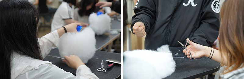학생들은 반려견 위그를 활용해서 실습을 시작했는데요. 애견미용학과 교수님의 강의를 통해 습득한 브러싱 스킬과 미용 스킬을 직접 활용해보기도 하고, 교수님은 학생들의 실습 현장을 둘러보며 도구를 올바르게 잡는 법, 좀 더 섬세하게 브러싱하는 방법 등 일대일로 지도하는 등, 화기애애한 분위기 속에서 체험특강이 진행되었습니다.