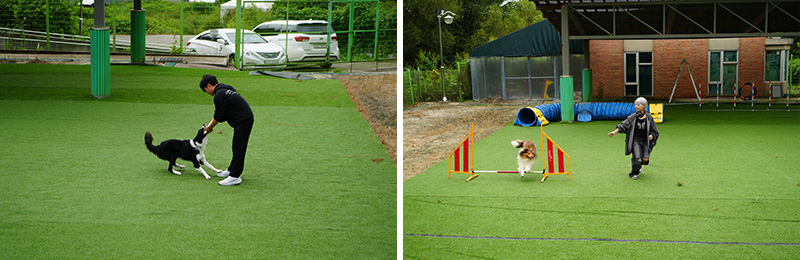 이다음에 이어진 특강은 반려견 훈련 체험인데요. 서울호서 반려동물에서 함께하고 있는 다양한 견들을 직접 만나 교감하고 예절, 클리커, 기본복종 등 여러 종류의 독스포츠를 직접 체험하는 시간을 가졌습니다.