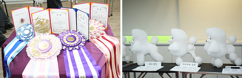 반려동물미용 과정에서는 반려동물의 귀, 발톱 관리, 브러싱 등 기본적인 위생 미용 이해도를 높일 수 있는 물품이 전시되었는데요. 그동안 반려동물 미용과 관련하여 취득한 급수별 상장과 국내외 수상내역 출품작품을 통해 학생들의 섬세한 기술력과 2년동안의 훌륭한 성과를 한눈에 확인해볼 수 있었습니다.