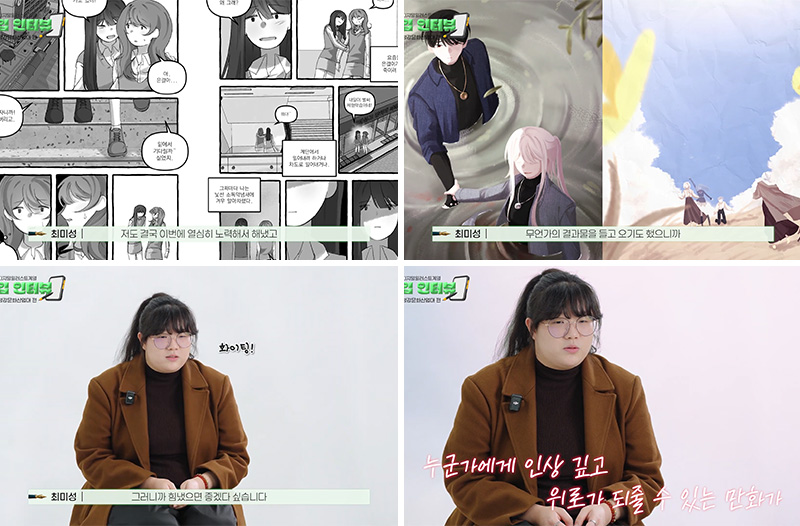 편입을 준비하면서 가장 공을 들인 부분은 포트폴리오였습니다. 선배는 단순히 그림을 잘 그리는 것보다, 메인 만화 안에 어떤 이야기를 담을지, 또 그 이야기를 어떻게 보여줄지를 더 중요하게 생각했다고 합니다. 실제 면접에서도 교수님들은 그림 자체보다 스토리의 흐름이나 연출 의도를 자주 질문했고, 그 과정에서 이야기의 힘이 얼마나 중요한지 다시 느낄 수 있었다고 했습니다.