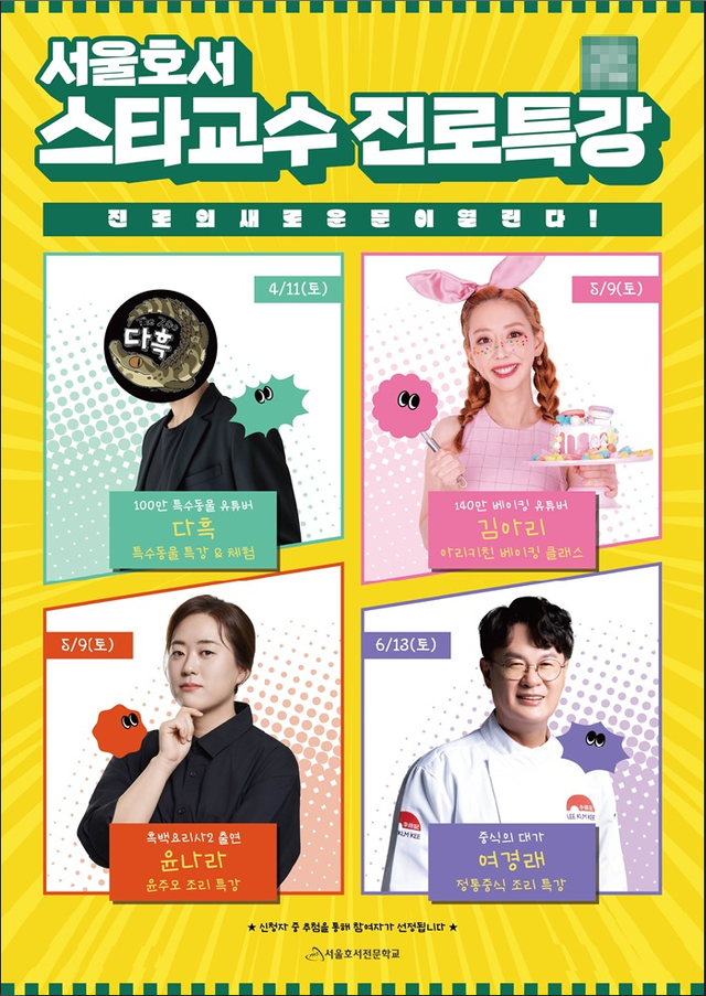 호텔조리계열에서는 ‘흑백요리사 시즌2’ 최종 TOP5에 오른 윤나라 교수가 ‘윤주모 조리특강’을 진행하며, 중식 분야에서는 여경래 셰프의 체험특강도 준비됐다.