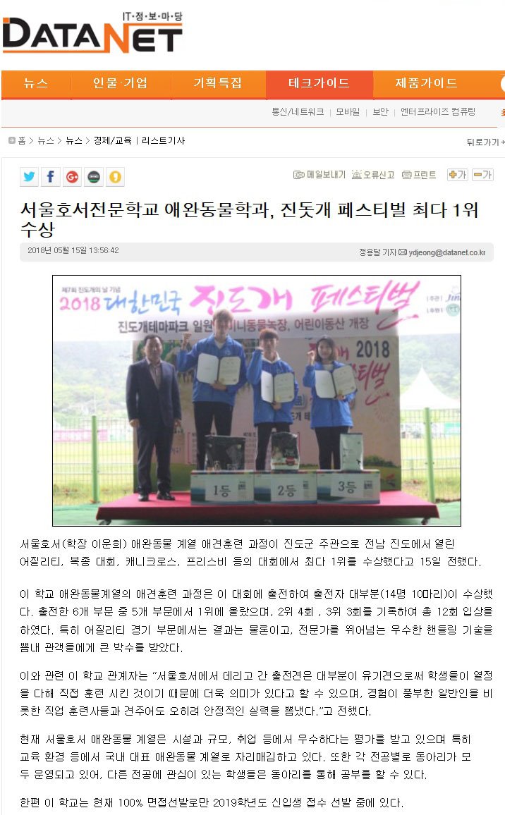 서울호서(학장 이운희) 애완동물 계열 애견훈련 과정이 진도군 주관으로 전남 진도에서 열린 어질리티, 복종 대회, 캐니크로스, 프리스비 등의 대회에서 최다 1위를 수상했다고 15일 전했다.