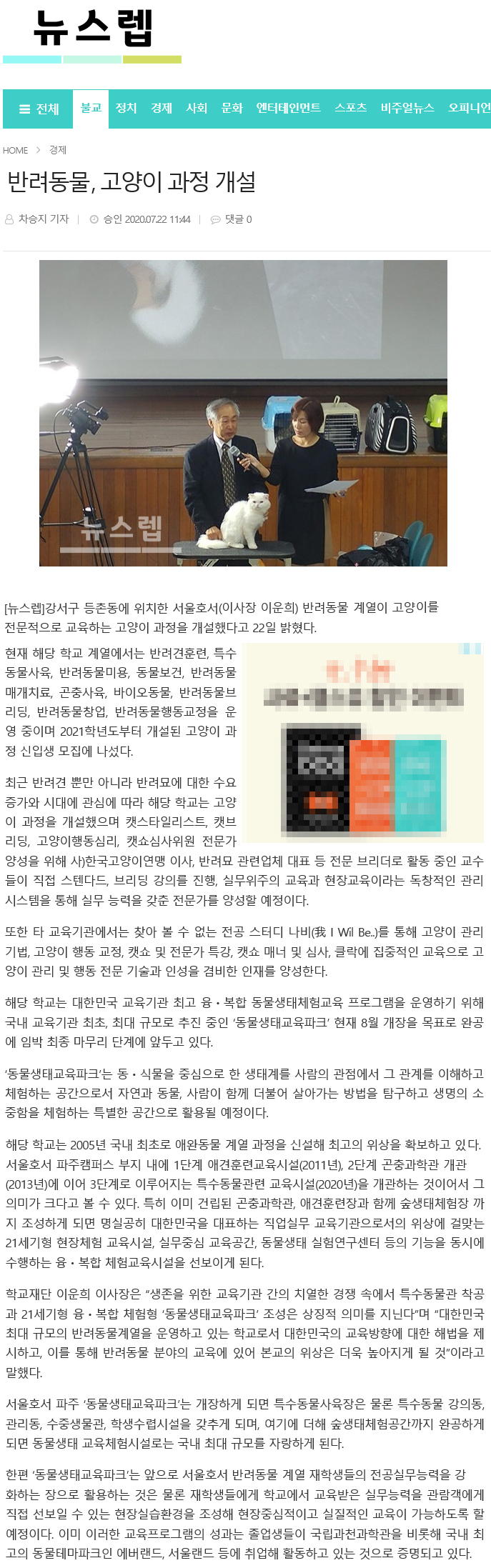 최근 반려견 뿐만 아니라 반려묘에 대한 수요 증가와 시대에 관심에 따라 해당 학교는 고양이 과정을 개설했으며 캣스타일리스트, 캣브리딩, 고양이행동심리, 캣쇼심사위원 전문가 양성을 위해 사)한국고양이연맹 이사, 반려묘 관련업체 대표 등 전문 브리더로 활동 중인 교수들이 직접 스텐다드, 브리딩 강의를 진행, 실무위주의 교육과 현장교육이라는 독창적인 관리 시스템을 통해 실무 능력을 갖춘 전문가를 양성할 예정이다.