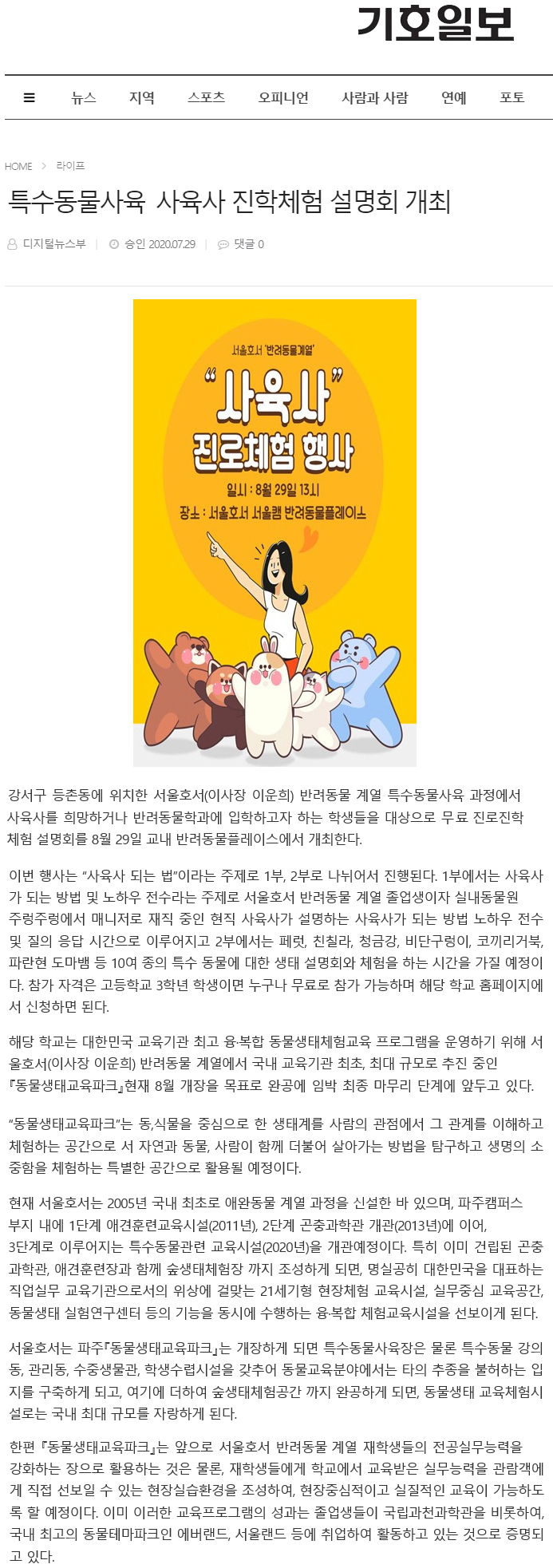 해당 학교는 대한민국 교육기관 최고 융·복합 동물생태체험교육 프로그램을 운영하기 위해 서울호서(이사장 이운희) 반려동물 계열에서 국내 교육기관 최초, 최대 규모로 추진 중인『동물생태교육파크』현재 8월 개장을 목표로 완공에 임박 최종 마무리 단계에 앞두고 있다.