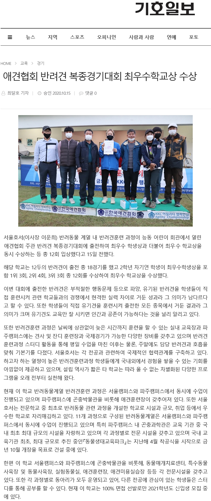 서울호서(이사장 이운희) 반려동물 계열 내 반려견훈련 과정이 능동 어린이회관에서 열린 애견협회 주관 반려견 복종경기대회에 출전하여 최우수 학생상과 더불어 최우수 학교상을 동시 수상하는 등 총 12회 입상했다고 15일 전했다.
