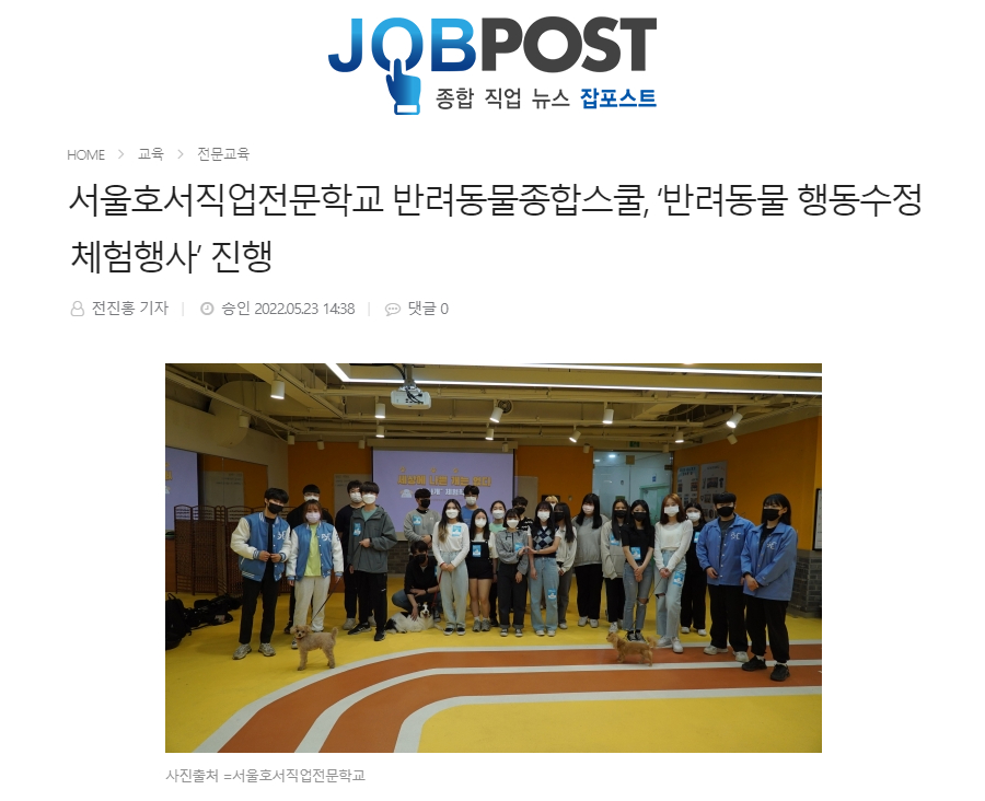 서울호서직업전문학교(이사장 이운희) 반려동물종합스쿨은 지난 21일 서울캠퍼스 핸들링 실습실에서 고등학생을 대상으로 반려동물 행동수정 체험행사를 성공적으로 진행했다고 전했다.