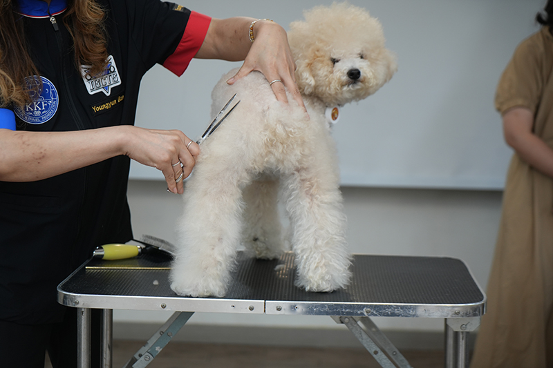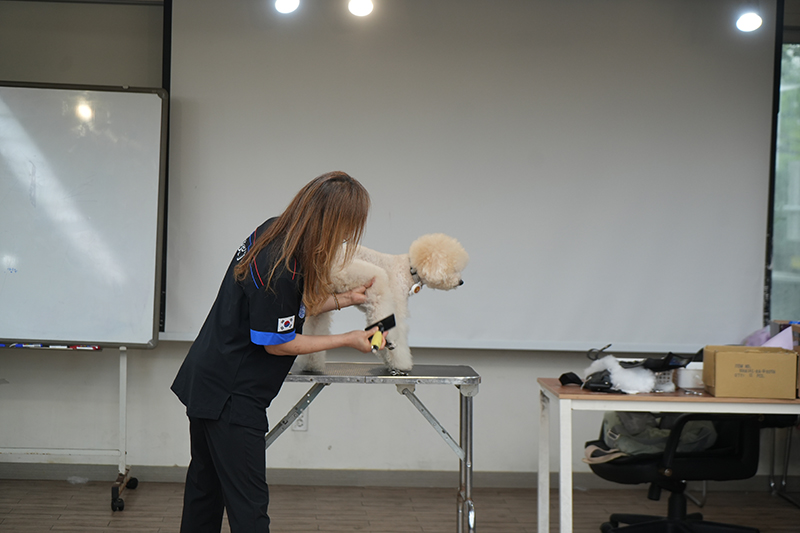 이후에는 교수님이 직접 반려견 미용 시연을 선보였습니다. 브러싱 스킬과 미용 스킬 등 반려동물 미용에 필요한 기술을 차근차근 설명해 주시며 학생들에게 지도했는데요.