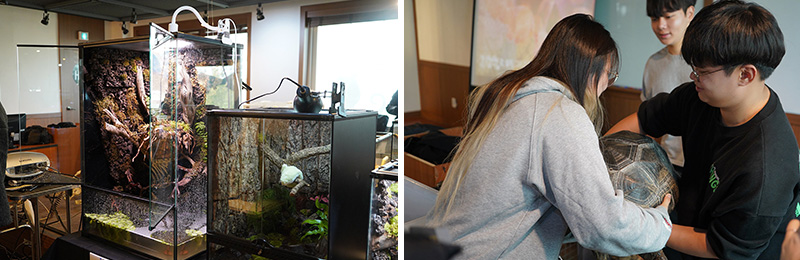 특수동물사육 과정에서는 학생들이 직접 제작한 개성 넘치는 비바리움을 전시하여 방문객의 시선을 사로잡았습니다. 평소 일상에서 접하기 어려운 다양한 특수동물에게 직접 먹이를 주고 핸들링을 해보는 이색적인 체험은 방문객에게 폭발적인 인기를 얻었습니다.