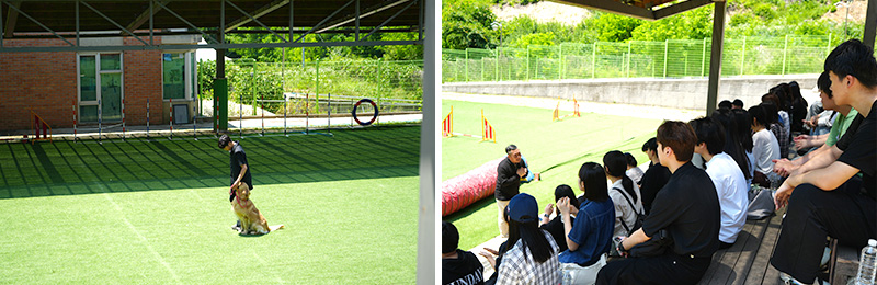 다음 순서로는 반려견 훈련사 체험이 이어졌습니다. 서울호서 파주캠퍼스에서 재학생들이 정성껏 돌보고 있는 반려견들이 함께 참여해 참가자들을 따뜻하게 맞이해주었는데요,