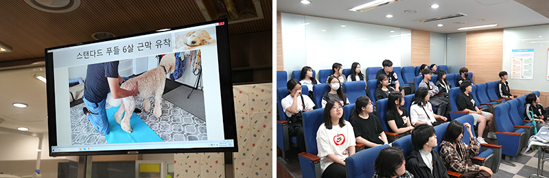 교수님의 시연과 설명 이후에는 서울호서 동물보건·재활치료계열의 재활물리치료센터로 자리를 이동하여, 서울호서 동물보건·재활치료계열을 졸업하고, 현재 동물병원에서 재활치료사로 근무 중인 김O림 선배의 특강이 이어졌습니다.