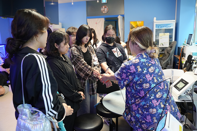 체험특강에 참가한 학생들은 직접 반려견을 핸들링하며, 수중 러닝머신을 활용한 재활물리치료를 체험해보는 시간을 가졌습니다. 또한 재활물리치료센터에 설치된 다양한 장비들을 활용해 반려동물 도수치료 과정을 실제로 경험하며, 전문적인 치료 시스템에 대해 이해하며 진로에 한 발짝 나아갈 수 있는 시간이었습니다.
