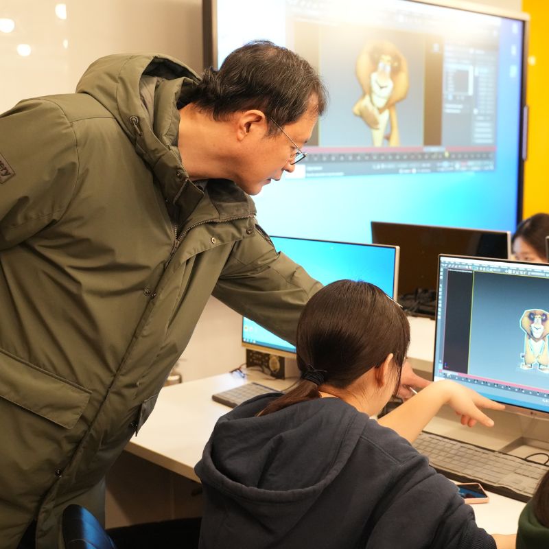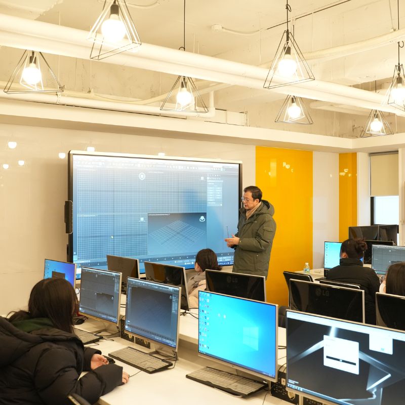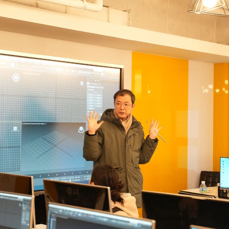 교수님의 시연이 끝난 후, 학생들은 직접 3D MAX 프로그램을 활용하여 3D 페이셜 애니메이션 제작을 체험해보았습니다. 어렵게만 느껴졌던 3D 프로그램을 교수님의 친절한 설명과 개별 지도, 그리고 세심한 피드백을 통해 더욱 쉽게 접근하고 다루게 된 뜻깊은 시간이었습니다.