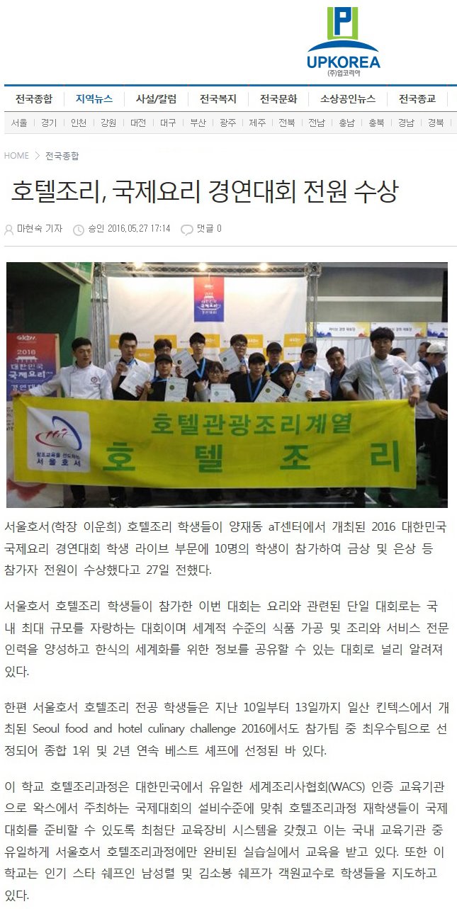 한편 서울호서 호텔조리 전공 학생들은 지난 10일부터 13일까지 일산 킨텍스에서 개최된 Seoul food and hotel culinary challenge 2016에서도 참가팀 중 최우수팀으로 선정되어 종합 1위 및 2년 연속 베스트 셰프에 선정된 바 있다.