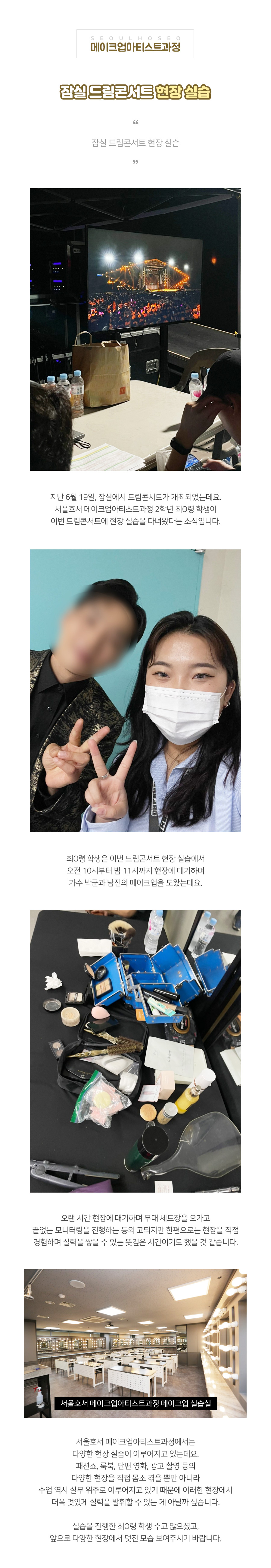 지난 6월 19일, 잠실에서 드림콘서트가 개최되었는데요. 서울호서 메이크업아티스트과정 2학년 최O령 학생이 이번 드림콘서트에 현장 실습을 다녀왔다는 소식입니다. 최O령 학생은 이번 드림콘서트 현장 실습에서 오전 10시부터 밤 11시까지 현장에 대기하며 가수 박군과 남진의 메이크업을 도왔는데요. 오랜 시간 현장에 대기하며 무대 세트장을 오가고 끝없는 모니터링을 진행하는 등의 고되지만 한편으로는 현장을 직접 경험하며 실력을 쌓을 수 있는 뜻깊은 시간이기도 했을 것 같습니다.