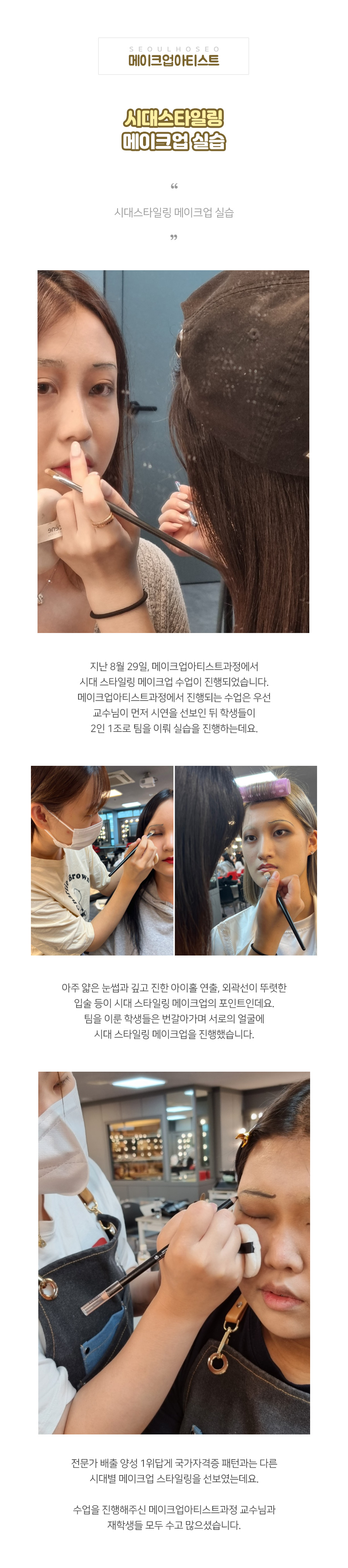 지난 8월 29일, 메이크업아티스트과정에서 시대 스타일링 메이크업 수업이 진행되었습니다. 메이크업아티스트과정에서 진행되는 수업은 우선 교수님이 먼저 시연을 선보인 뒤 학생들이 2인 1조로 팀을 이뤄 실습을 진행하는데요.