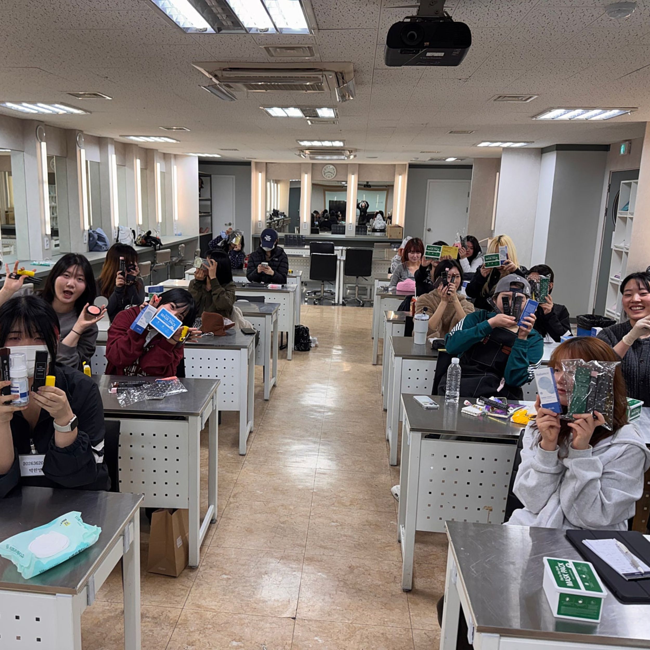 특히 제품을 직접 사용해보며 실습에 몰입하는 학생들의 모습이 인상적이었는데요. 기초 스킨케어부터 색조 메이크업까지 이어지는 과정 속에서 학생들의 눈빛과 손길에서는 진지함과 열정이 고스란히 느껴졌습니다.
