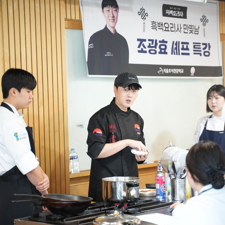 2024년 대한민국을 뜨겁게 달군 요리 프로그램 <흑백요리사>에 출연하여 감동적인 서사와 센스 있는 요리 실력을 선보였던 만찢남 조광효 셰프가 지난 11월 21일 서울호서 호텔조리계열을 찾아왔습니다. 조광효 교수님은 <흑백요리사>에서 100인 요리사 중 상위 15인에 오른 실력파 셰프님인데요, 이날 호텔조리계열 학생들에게 중식 조리 실무 수업으로 동파육과 마파두부 두 개의 요리를 재학생들에게 직접 선보였습니다.