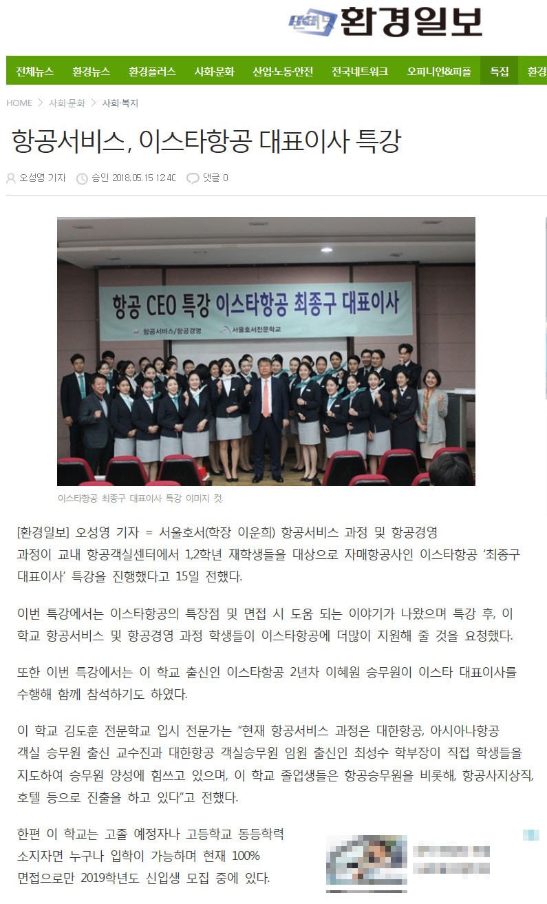 [환경일보] 오성영 기자 = 서울호서(학장 이운희) 항공서비스 과정 및 항공경영 과정이 교내 항공객실센터에서 1,2학년 재학생들을 대상으로 자매항공사인 이스타항공 ‘최종구 대표이사’ 특강을 진행했다고 15일 전했다.