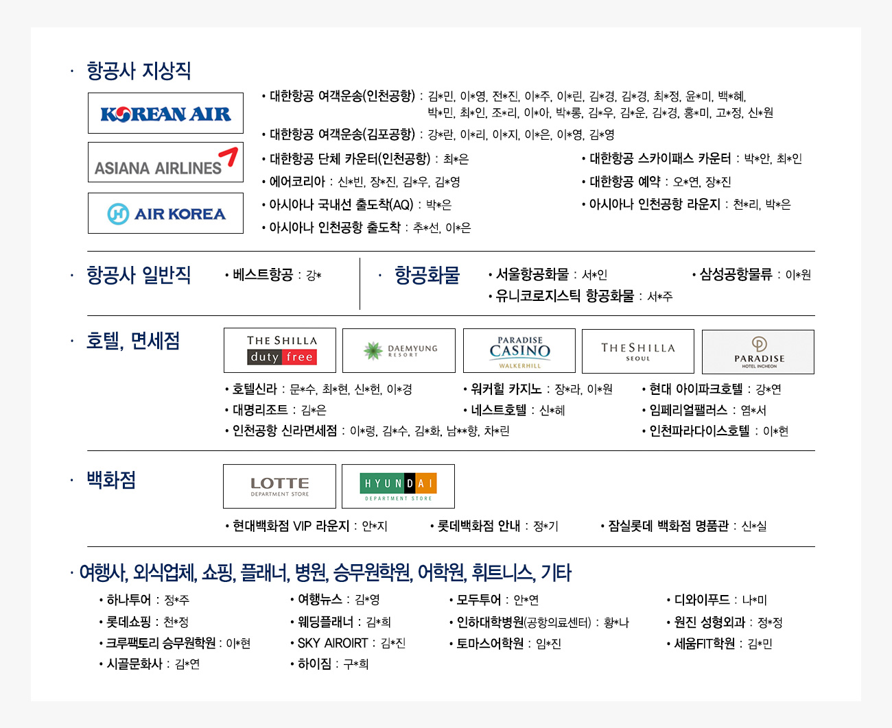 공사 지상직 : 예약발권, 체크-인 카운터, FLR SVC, 라운지, 출발게이트, 도착 게이트, 수화물 핸들링, 출입국 심사, 전세기 사업부, GSA 외항사 본사 업무