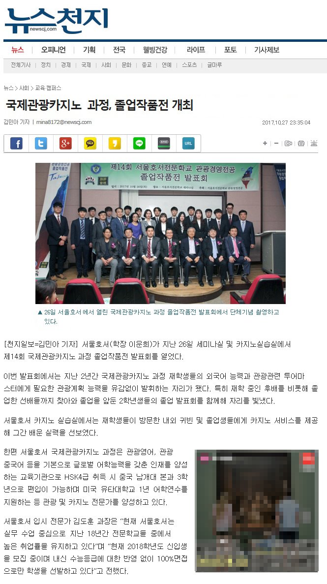 [천지일보=김민아 기자] 서울호서(학장 이운희)가 지난 26일 세미나실 및 카지노실습실에서 제14회 국제관광카지노 과정 졸업작품전 발표회를 열었다.