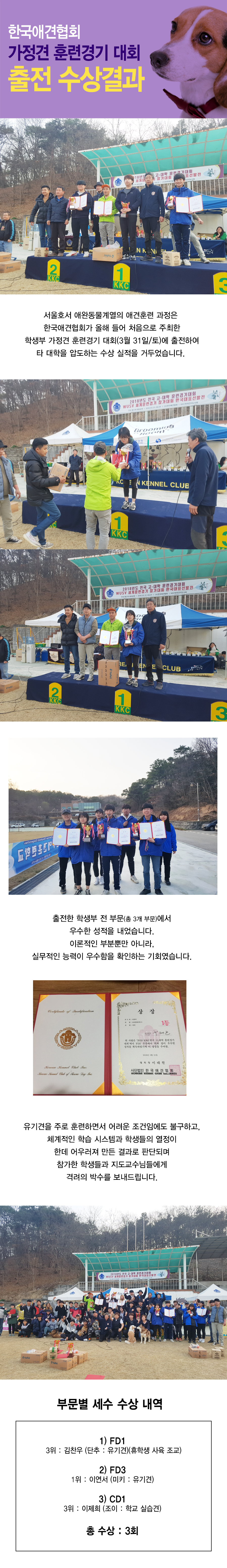서울호서 애완동물계열의 애견훈련 과정은 한국애견협회가 올해 들어 처음으로 주최한 학생부 가정견 훈련경기 대회(3월 31일/토) 대회에 출전하여 타 대학을 압도하는 수상 실적을 거두었습니다.