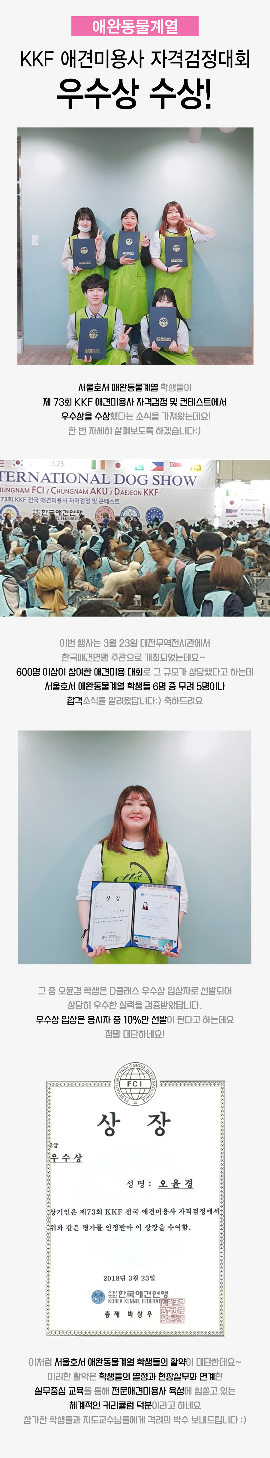 서울호서 애완동물계열 학생들이 제73회 KKF 애견미용사 자격검정 및 컨테스트에서 우수상을 수상했다는 소식을 가져왔는데요!