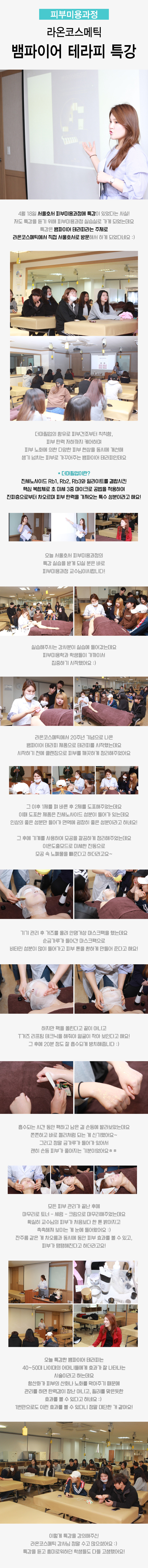 4월 18일 서울호서 피부미용과정에 특강이 있었다는 사실! 저도 특강을 듣기 위해 피부미용과정 실습실로 가게 되었는데요 특강은 뱀파이어 테라피라는 주제로 라온코스메틱에서 직접 서울호서로 방문해서 하게 되었다네요 :)