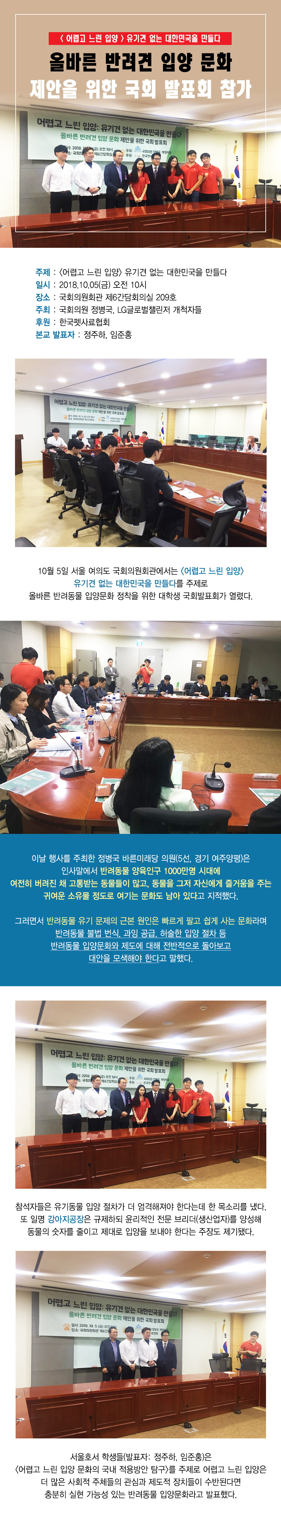 10월 5일 서울 여의도 국회의원회관에서는 '어렵고 느린 입양: 유기견 없는 대한민국을 만들다'를 주제로 올바른 반려동물 입양문화 정착을 위한 대학생 국회발표회가 열렸다.