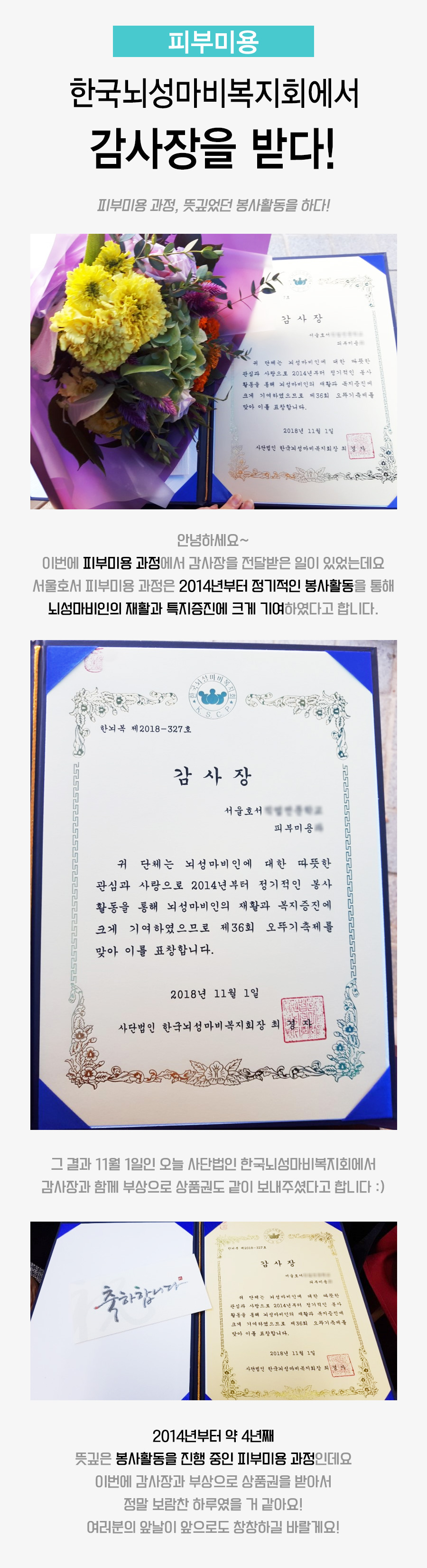 안녕하세요~이번에 피부미용 과정에서 감사장을 전달받은 일이 있었는데요서울호서 피부미용 과정은 2014년부터 정기적인 봉사활동을 통해뇌성마비인의 재활과 특지증진에 크게 기여하였다고 합니다.