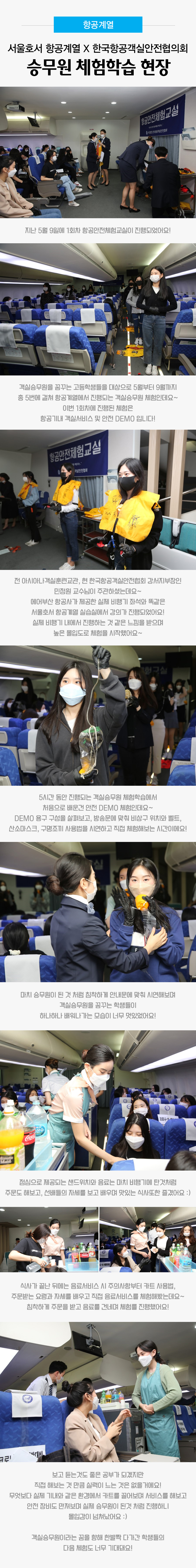 지난 5월 9일에 1회차 항공안전체험교실이 진행되었어요! 객실승무원을 꿈꾸는 고등학생들을 대상으로 5월부터 9월까지 총 5번에 걸쳐 항공계열에서 진행되는 객실승무원 체험인데요~