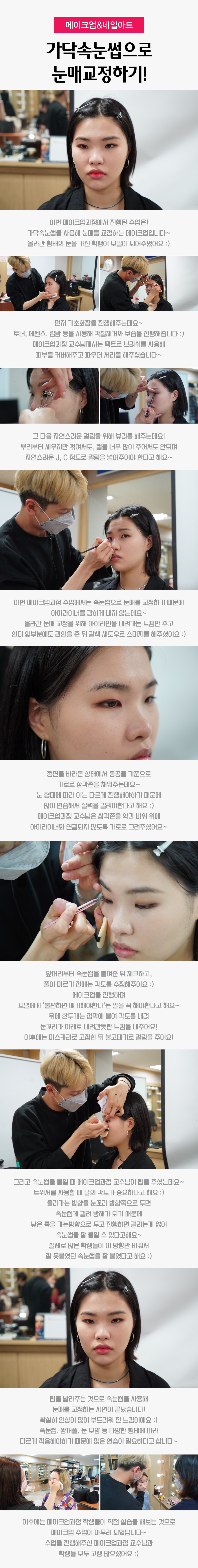 이번 메이크업과정에서 진행된 수업은! 가닥속눈썹을 사용해 눈매를 교정하는 메이크업입니다~ 올라간 형태의 눈을 가진 학생이 모델이 되어주었어요 :)