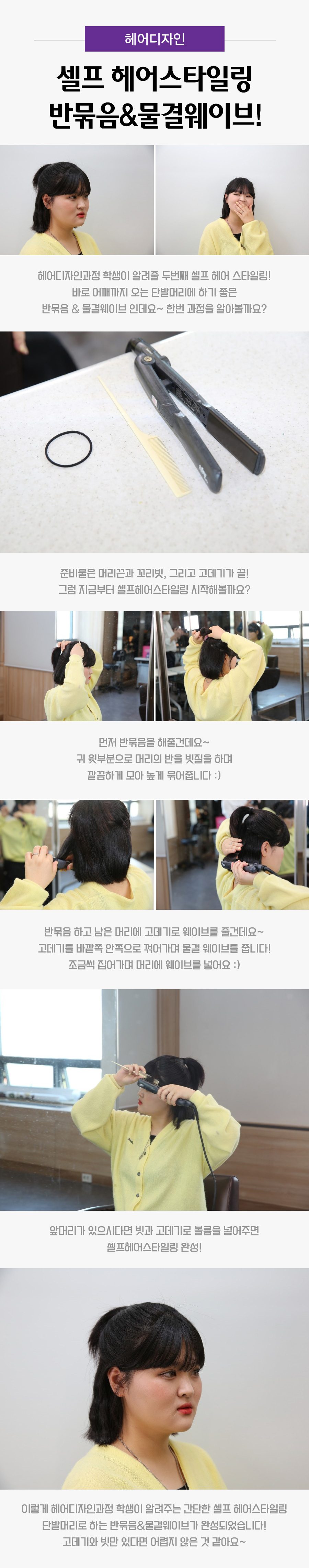 헤어디자인과정 학생이 알려줄 두번째 셀프 헤어 스타일링! 바로 어깨까지 오는 단발머리에 하기 좋은 반묶음 & 물결웨이브 인데요~ 한번 과정을 알아볼까요?