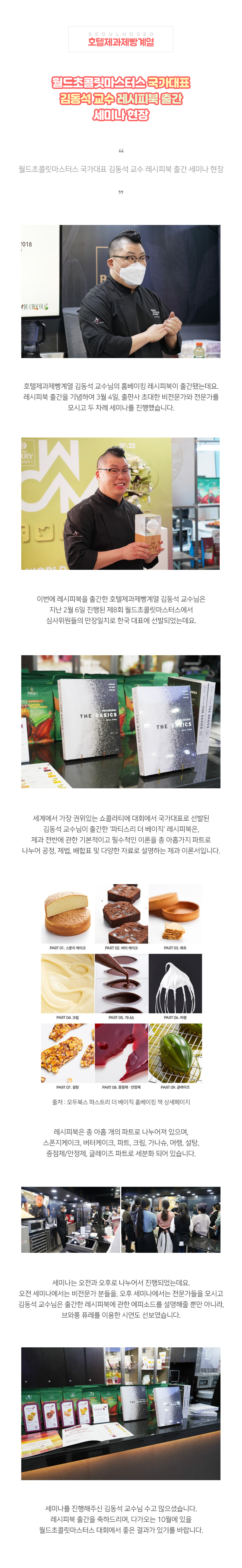 호텔제과제빵계열 김동석 교수님의 홈베이킹 레시피북이 출간됐는데요. 레시피북 출간을 기념하여 3월 4일, 출판사 초대한 비전문가와 전문가를 모시고 두 차례 세미나를 진행했습니다. 이번에 레시피북을 출간한 호텔제과제빵계열 김동석 교수님은 지난 2월 6일 진행된 제8회 월드초콜릿마스터스에서 심사위원들의 만장일치로 한국 대표에 선발되었는데요.