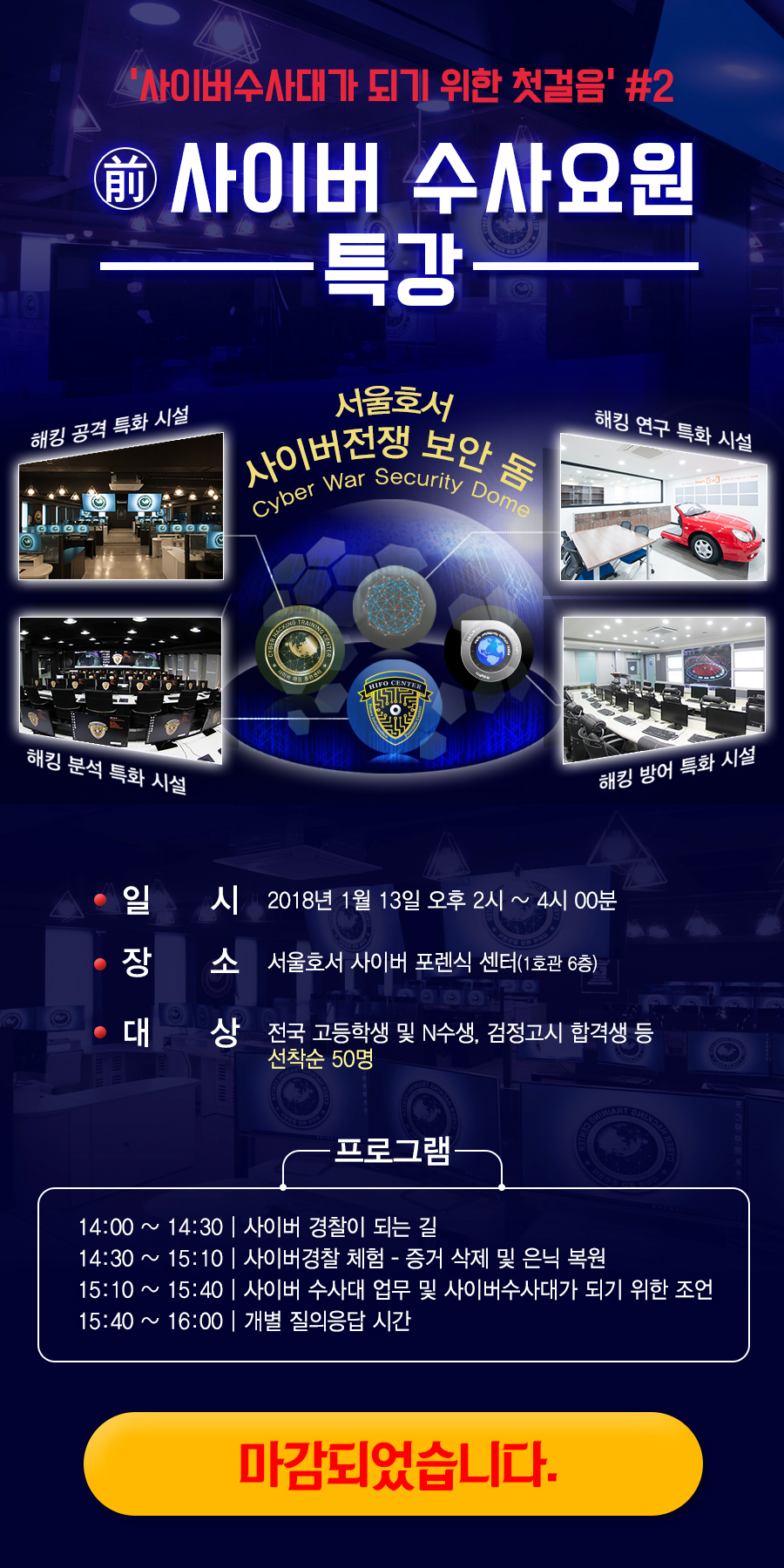 일시 : 2018년 1월 13일(토) 오후 2시 ~ 4시 00분 / 장소 : 서울호서 사이버 포렌식 센터(1호관 6층) / 대상 : 전국 고등학생 및 N수생, 검정고시 합격생 등 선착순 50명