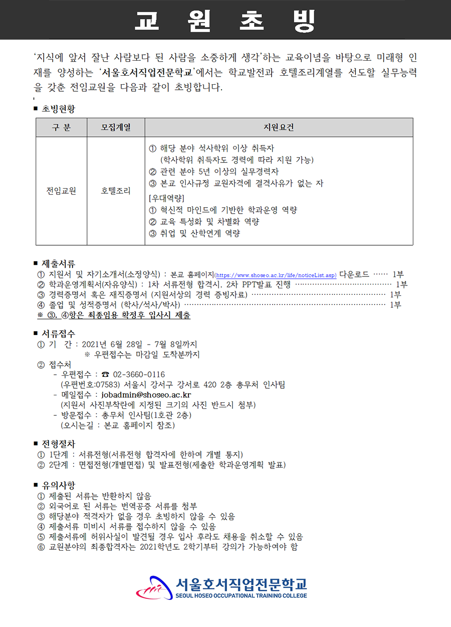 호텔조리 교원 초빙 공고