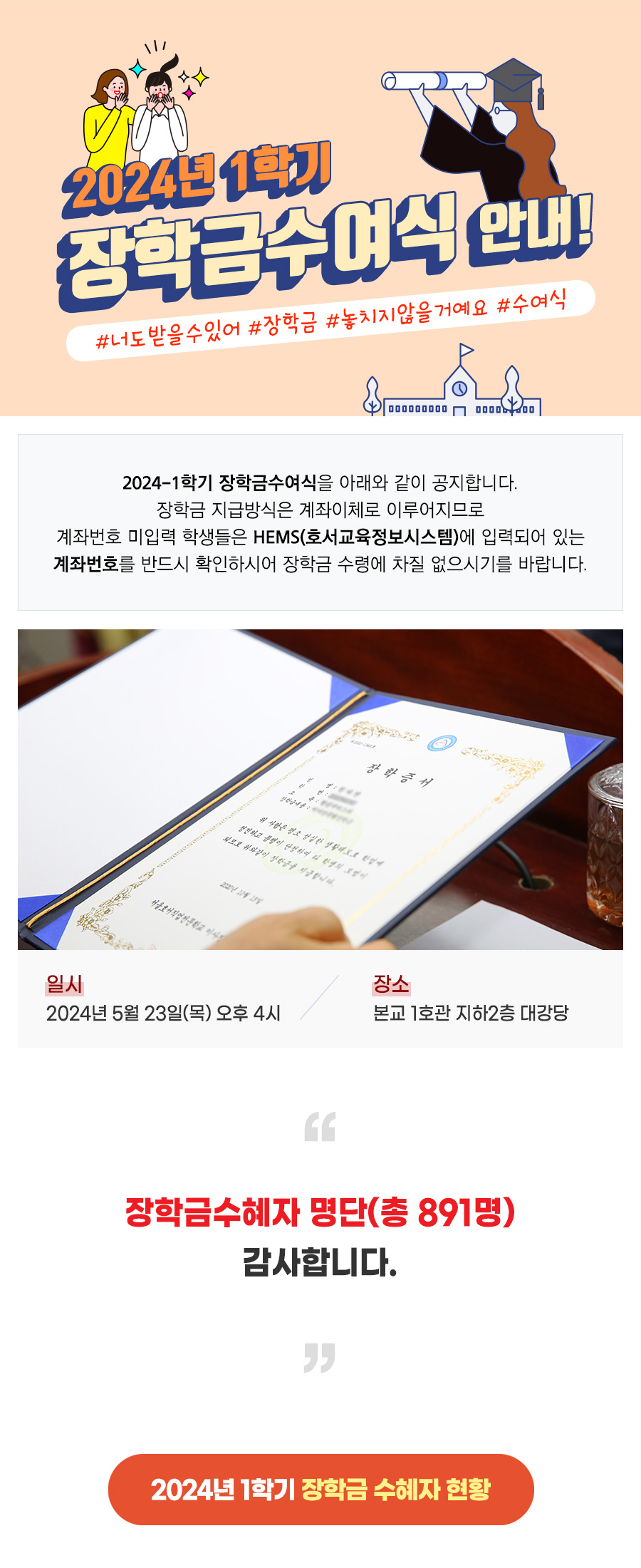 2024-1학기 장학금수여식을 아래와 같이 공지합니다. 장학금 지급방식은 계좌이체로 이루어지므로 계좌번호 미입력 학생들은 HEMS(호서교육정보시스템)에 입력되어 있는 계좌번호를 반드시 확인하시어 장학금 수령에 차질 없으시기를 바랍니다.