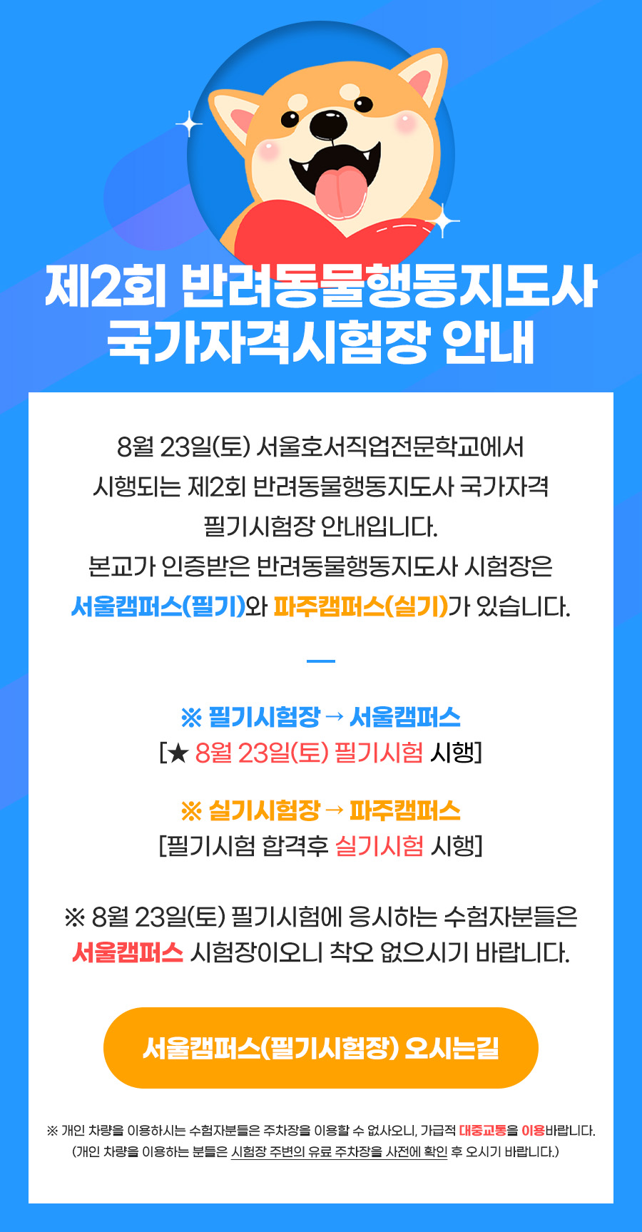 8월 23일(토) 서울호서직업전문학교에서 시행되는 제1회 반려동물행동지도사 국가자격 필기시험장 안내입니다.