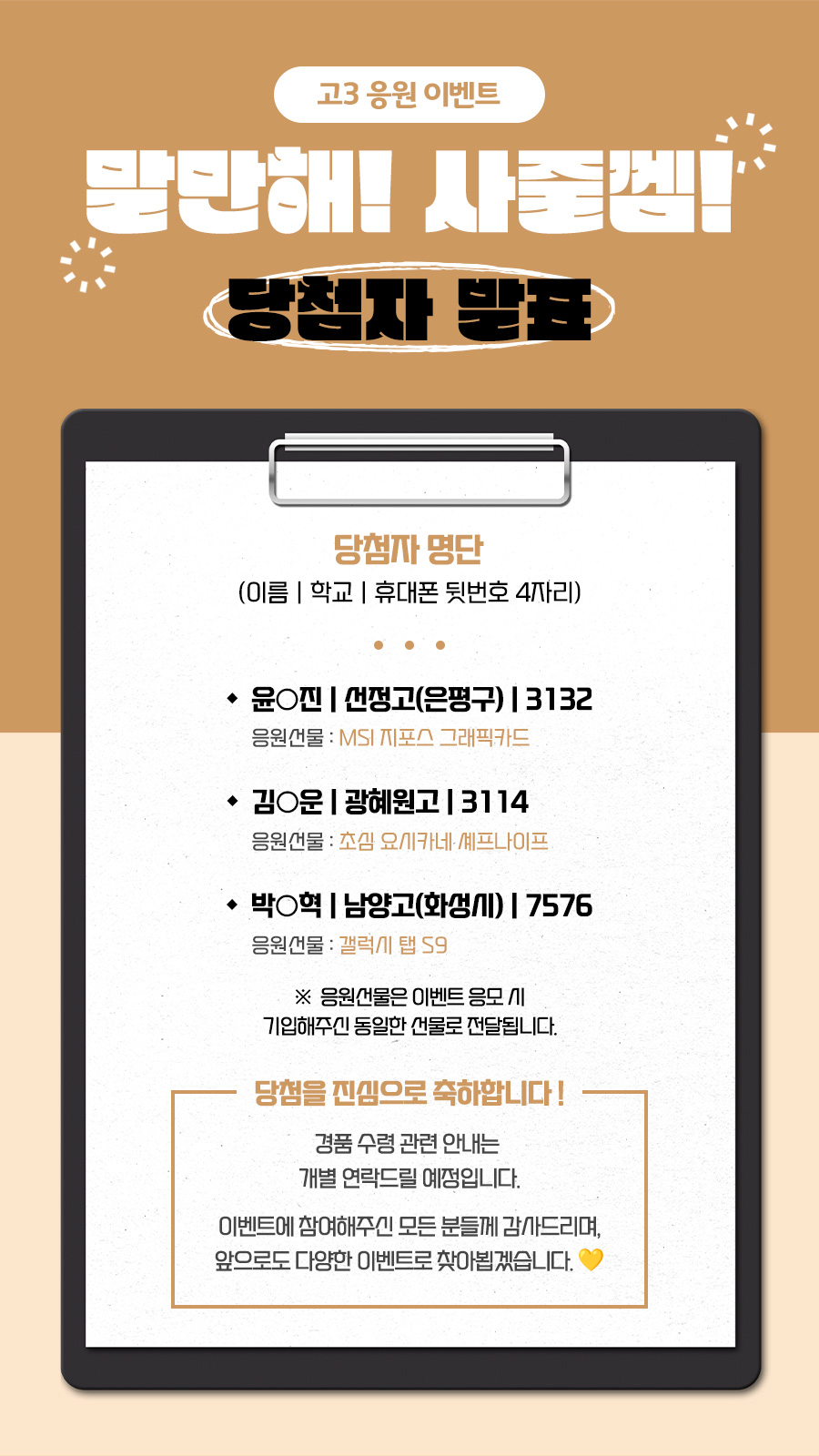 고3 응원 이벤트, 말만해! 사줄껨! 당첨자 발표